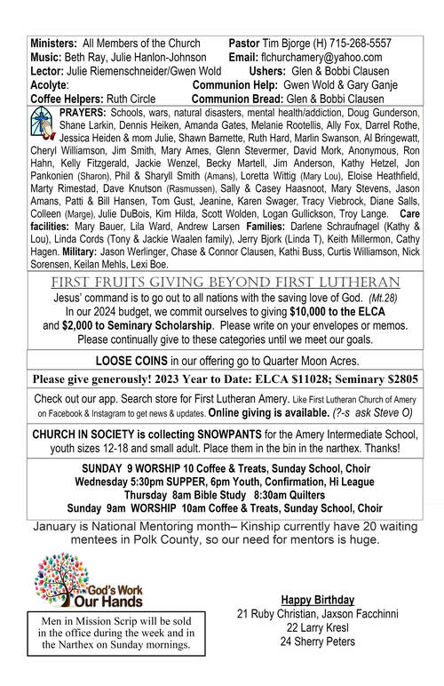 Bulletin: January 5, 2025Congregational Update: 1/3/2025Youth Update 1/3/2025Congregational Update: 1/10/2025Bulletin: January 12, 2025Youth Update 1/10/2025Congregational Update: 1/17/2025Bulletin: January 19, 2025Congregational Update: 1/24/2025Youth Update 1/25/2025Bulletin: January 26, 2025Congregational Update: 1/31/2025Bulletin: February 2, 2025