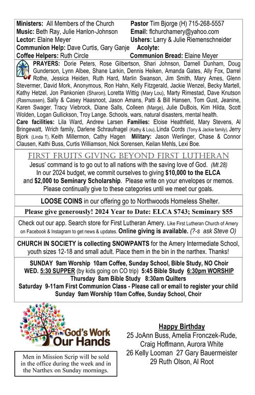 Bulletin: January 5, 2025Congregational Update: 1/3/2025Youth Update 1/3/2025Congregational Update: 1/10/2025Bulletin: January 12, 2025Youth Update 1/10/2025Congregational Update: 1/17/2025Bulletin: January 19, 2025Congregational Update: 1/24/2025Youth Update 1/25/2025Bulletin: January 26, 2025Congregational Update: 1/31/2025Bulletin: February 2, 2025