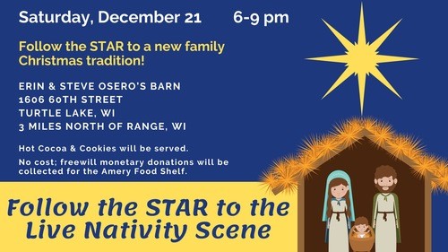 LIVE NATIVITY AT ERIN & STEVE OSERO'S BARN, 1606 60th St., Turtle Lake, WI (3 miles north of Range) 6-9pm Cocoa & Cookies served. No cost; Freewill donations for Amery Area Food Shelf