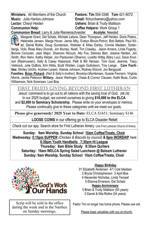 Youth Update 4/2/2025Youth Update 4/5/2025Congregational Update: April 4, 2025Bulletin: April 5, 2025Congregational Update: April 11, 2025Bulletin: April 13, 2025Congregational Update: April 17, 2025Bulletin: April 20, 2025 Easter SundayCongregational Update: April 25, 2025Bulletin: April 27, 2025Youth Update 4/27/2025