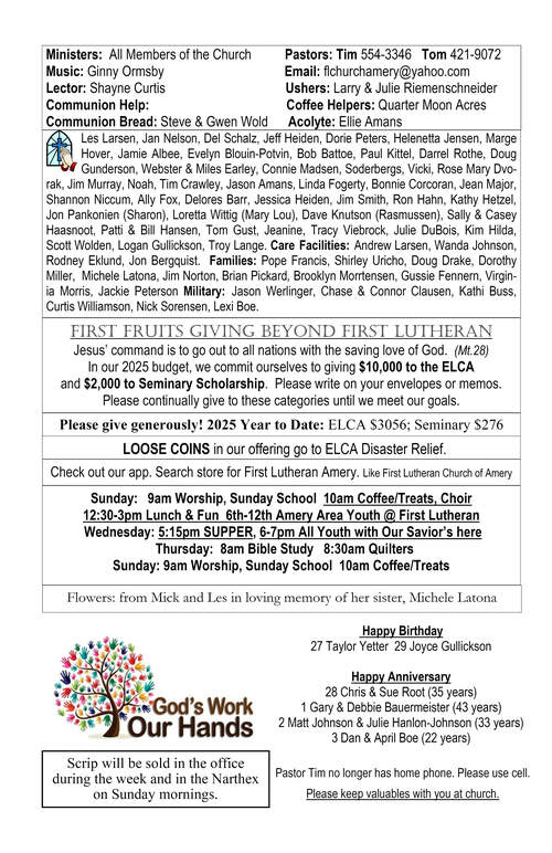 Bulletin: August 3, 2025Congregational Update: August 1, 2025Bulletin: August 10, 2025Congregational Update: August 8, 2025Bulletin: August 17, 2025Congregational Update: August 15, 2025Bulletin: August 24, 2025Congregational Update: August 22, 2025Youth Update August 28, 2025Bulletin: August 31, 2025Congregational Update: August 29, 2025