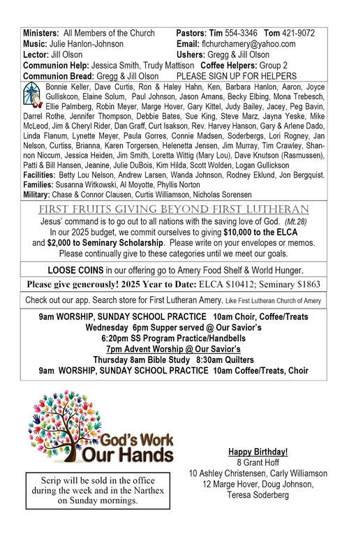Bulletin: January 5, 2025Congregational Update: 1/3/2025Youth Update 1/3/2025Congregational Update: 1/10/2025Bulletin: January 12, 2025Youth Update 1/10/2025Congregational Update: 1/17/2025Bulletin: January 19, 2025Congregational Update: 1/24/2025Youth Update 1/25/2025Bulletin: January 26, 2025Congregational Update: 1/31/2025Bulletin: February 2, 2025