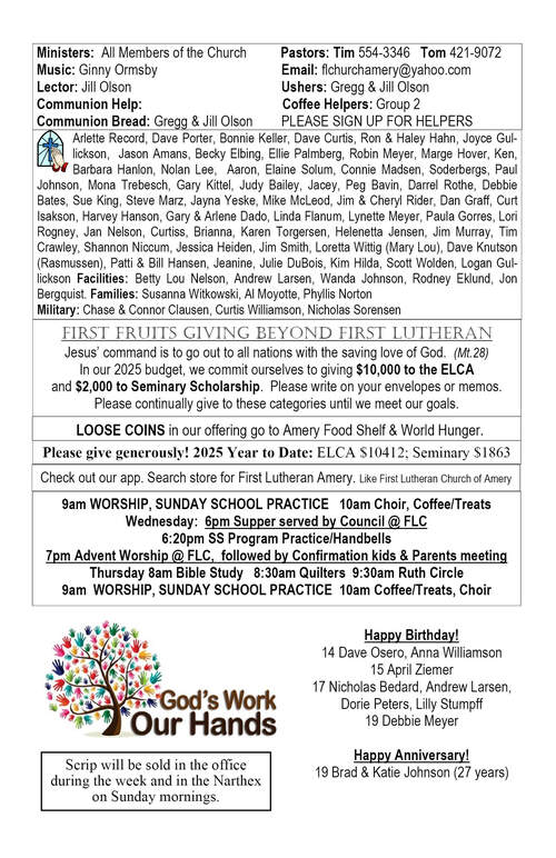 Bulletin: October 5, 2025Congregational Update: October 3, 2025Youth Update October 10, 2025Bulletin: October 12, 2025Congregational Update: October 10, 2025Bulletin: October 19, 2025Youth Update October 18, 2025Congregational Update: October 17, 2025Bulletin: October 26, 2025 Confirmation SundayCongregational Update: October 24, 2025Congregational Update: October 31, 2025