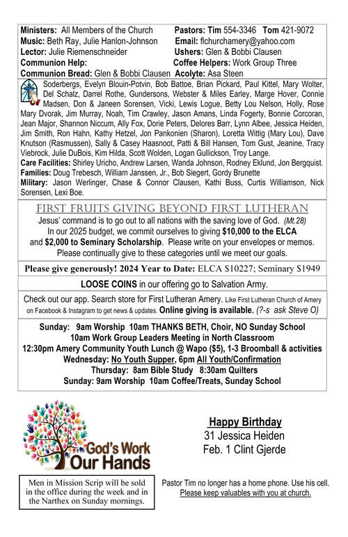 Bulletin: January 5, 2025Congregational Update: 1/3/2025Youth Update 1/3/2025Congregational Update: 1/10/2025Bulletin: January 12, 2025Youth Update 1/10/2025Congregational Update: 1/17/2025Bulletin: January 19, 2025Congregational Update: 1/24/2025Youth Update 1/25/2025Bulletin: January 26, 2025Congregational Update: 1/31/2025Bulletin: February 2, 2025