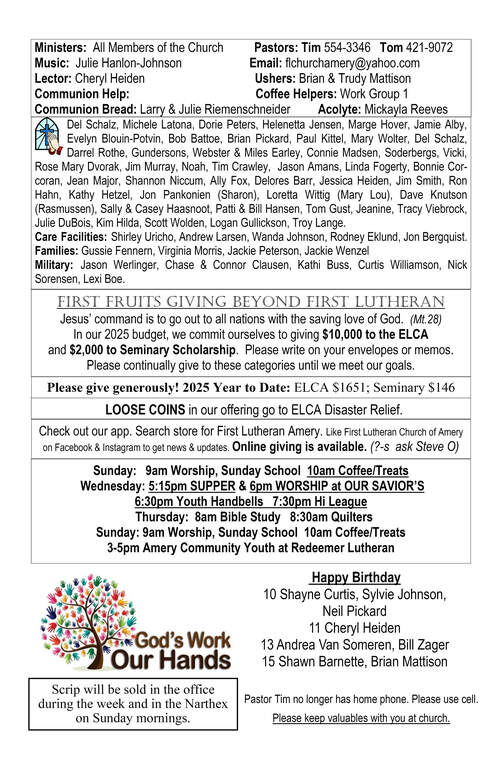 Bulletin: August 3, 2025Congregational Update: August 1, 2025Bulletin: August 10, 2025Congregational Update: August 8, 2025Bulletin: August 17, 2025Congregational Update: August 15, 2025Bulletin: August 24, 2025Congregational Update: August 22, 2025Youth Update August 28, 2025Bulletin: August 31, 2025Congregational Update: August 29, 2025
