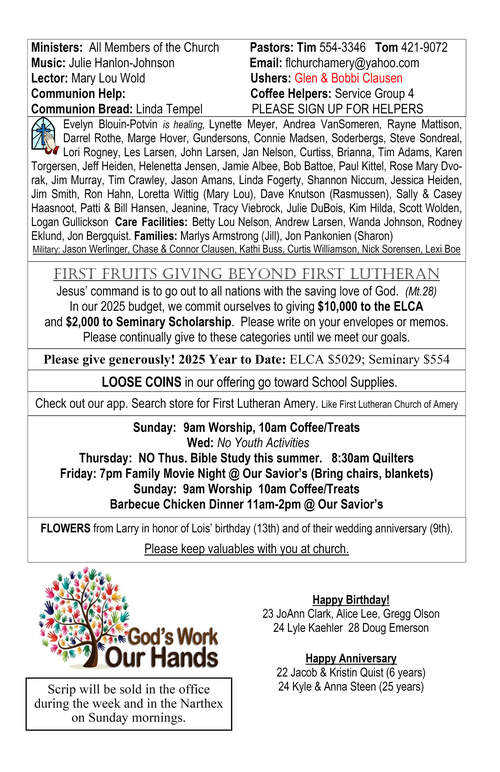 Bulletin: August 3, 2025Congregational Update: August 1, 2025Bulletin: August 10, 2025Congregational Update: August 8, 2025Bulletin: August 17, 2025Congregational Update: August 15, 2025Bulletin: August 24, 2025Congregational Update: August 22, 2025Youth Update August 28, 2025Bulletin: August 31, 2025Congregational Update: August 29, 2025