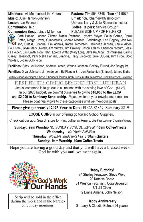 Bulletin: August 3, 2025Congregational Update: August 1, 2025Bulletin: August 10, 2025Congregational Update: August 8, 2025Bulletin: August 17, 2025Congregational Update: August 15, 2025Bulletin: August 24, 2025Congregational Update: August 22, 2025Youth Update August 28, 2025Bulletin: August 31, 2025Congregational Update: August 29, 2025