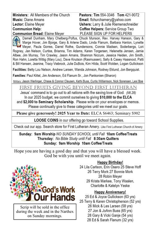 Bulletin: August 3, 2025Congregational Update: August 1, 2025Bulletin: August 10, 2025Congregational Update: August 8, 2025Bulletin: August 17, 2025Congregational Update: August 15, 2025Bulletin: August 24, 2025Congregational Update: August 22, 2025Youth Update August 28, 2025Bulletin: August 31, 2025Congregational Update: August 29, 2025